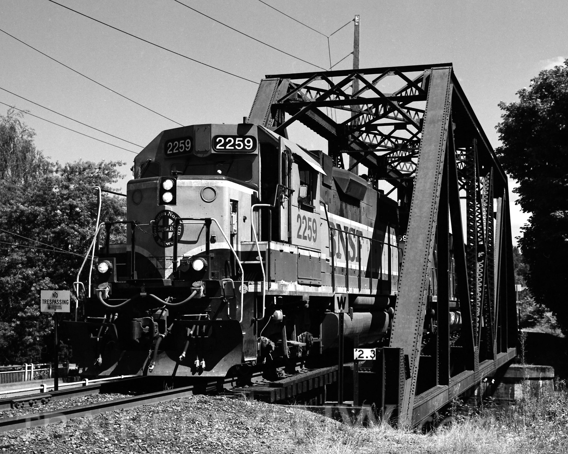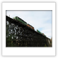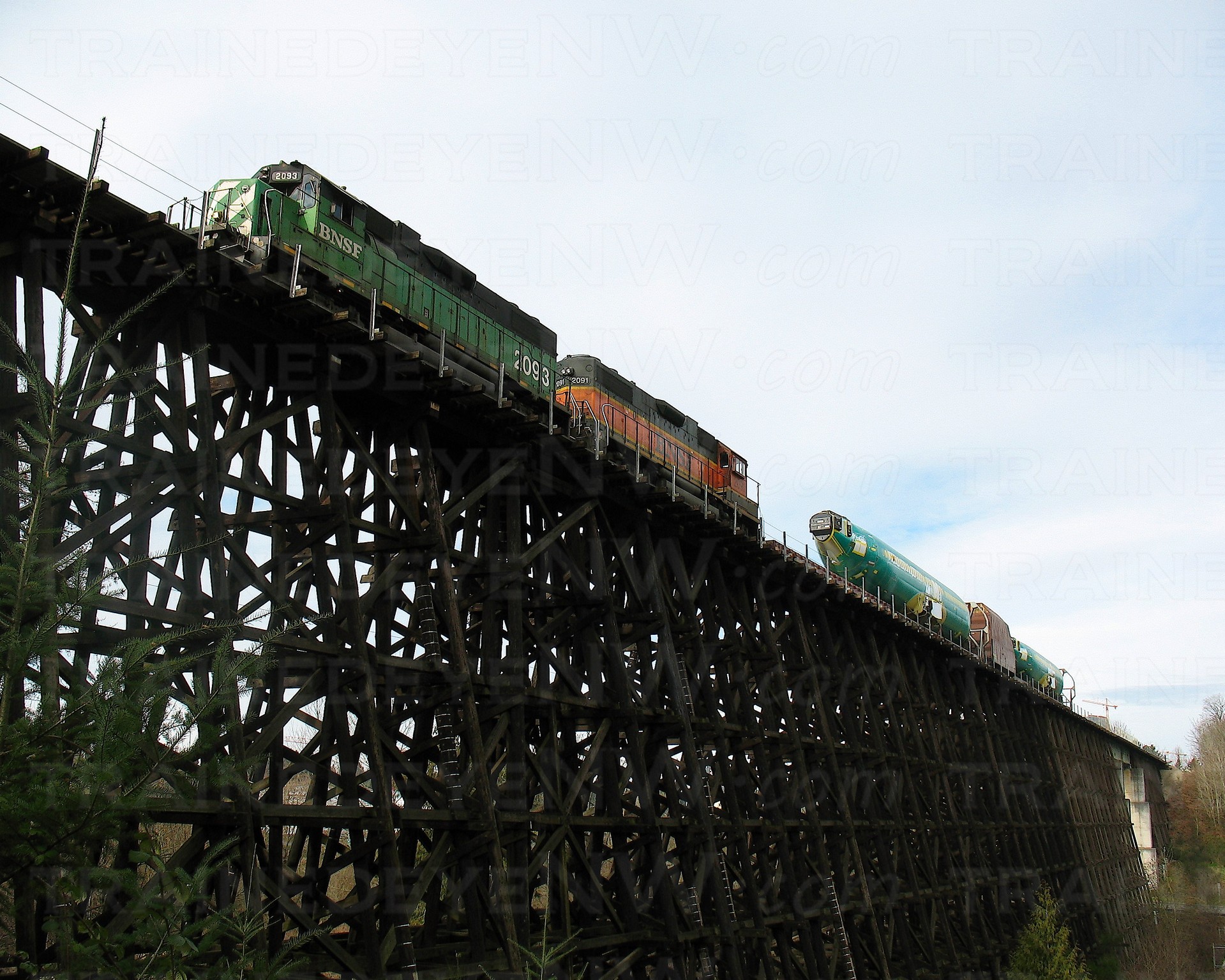 In May 1991, BN took a small train to the 7th Sub to do a photo shoot on the Wilberton trestle. The photos showcased the new “BN America” containers. BN 2187 and with 5 stack-cars loaded with containers posed on the trestle.
