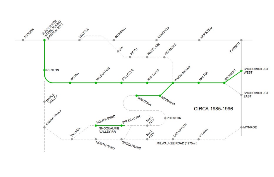 The Woodinville Sub In 1970, at the BN merger, there were a couple of former Northern Pacific branch lines that roamed around East King County. The 7th Subdivision went from the Black River Interlocking to Renton, to Woodinville and on up to Sumas. There was the 8th Subdivision from the north end of Stacy Street Yard in Seattle, went along the west side of Lake Washington to Woodinville, then up to North Bend. Then there was the 13th Subdivision from Argo to Renton, to Maple Valley and on up to Black Diamond.