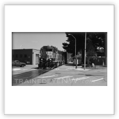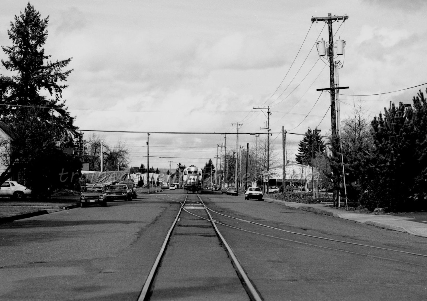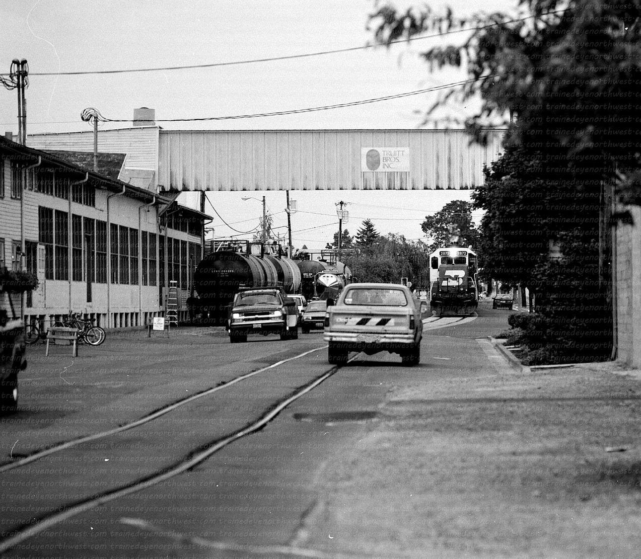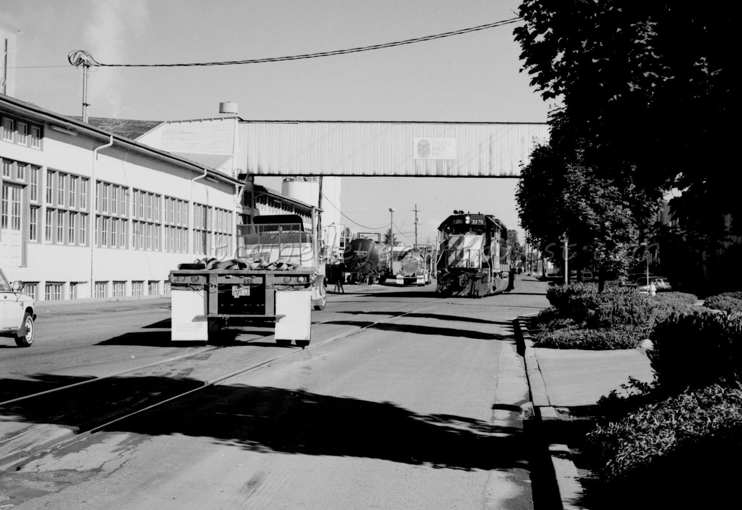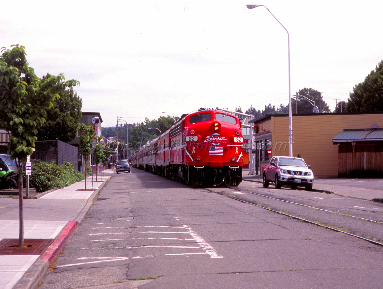 The most famous, and probably the most photographed, location for street running in the Northwest has to be in downtown Renton, WA where the old Pacific Coast Railroad mainline runs right down the middle of Houser Way South. The tracks enter the street at the intersection of South 4th Street and Burnett Ave S at the west end, and exit on the east side of Houser Way at Mill Avenue South. Up until the mid-1970s Milwaukee Road Little Joes could be seen running down the middle of the street. The Milwaukee Road disappeared in 1980. Then in the late 1980s came the Spirit of Washington Dinner Train for a period of time, now just Boeing 737 fuselages travel down Houser Way.
