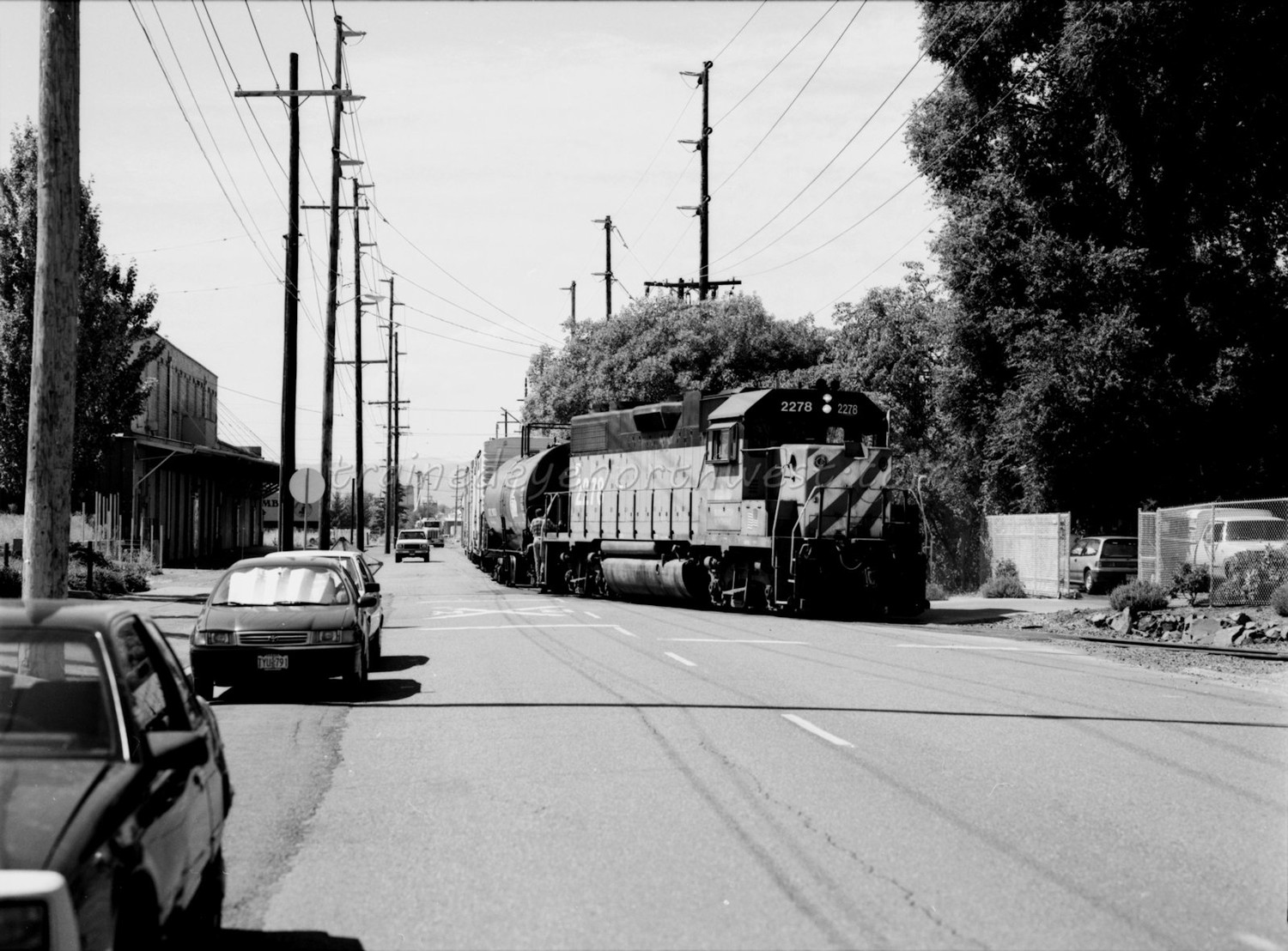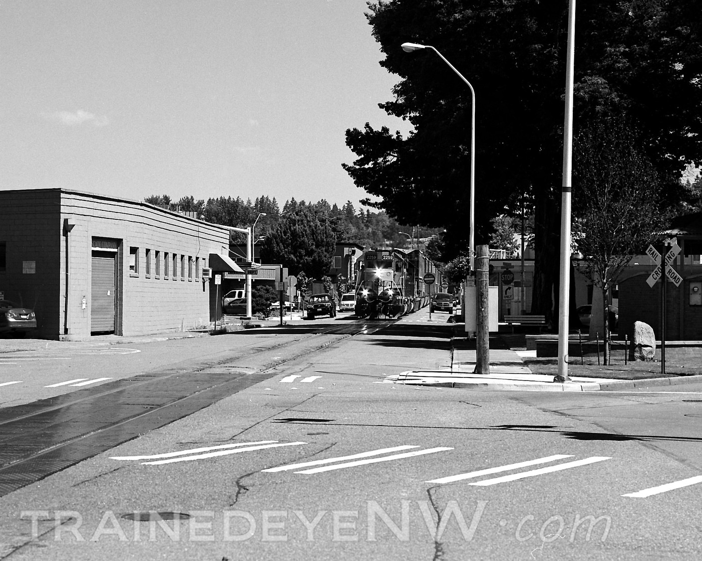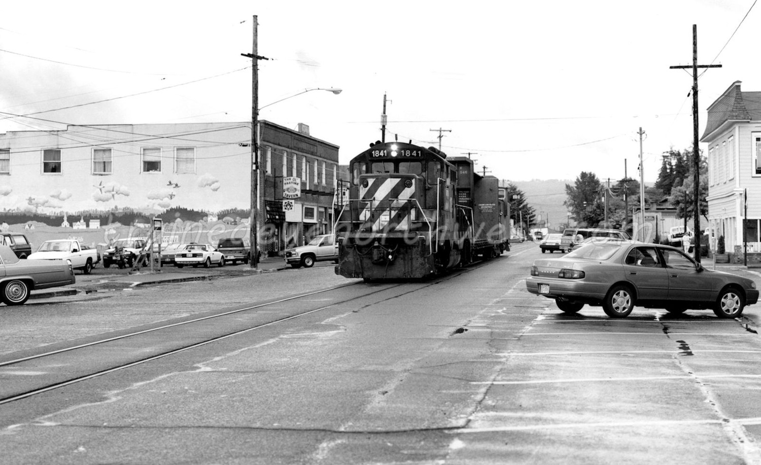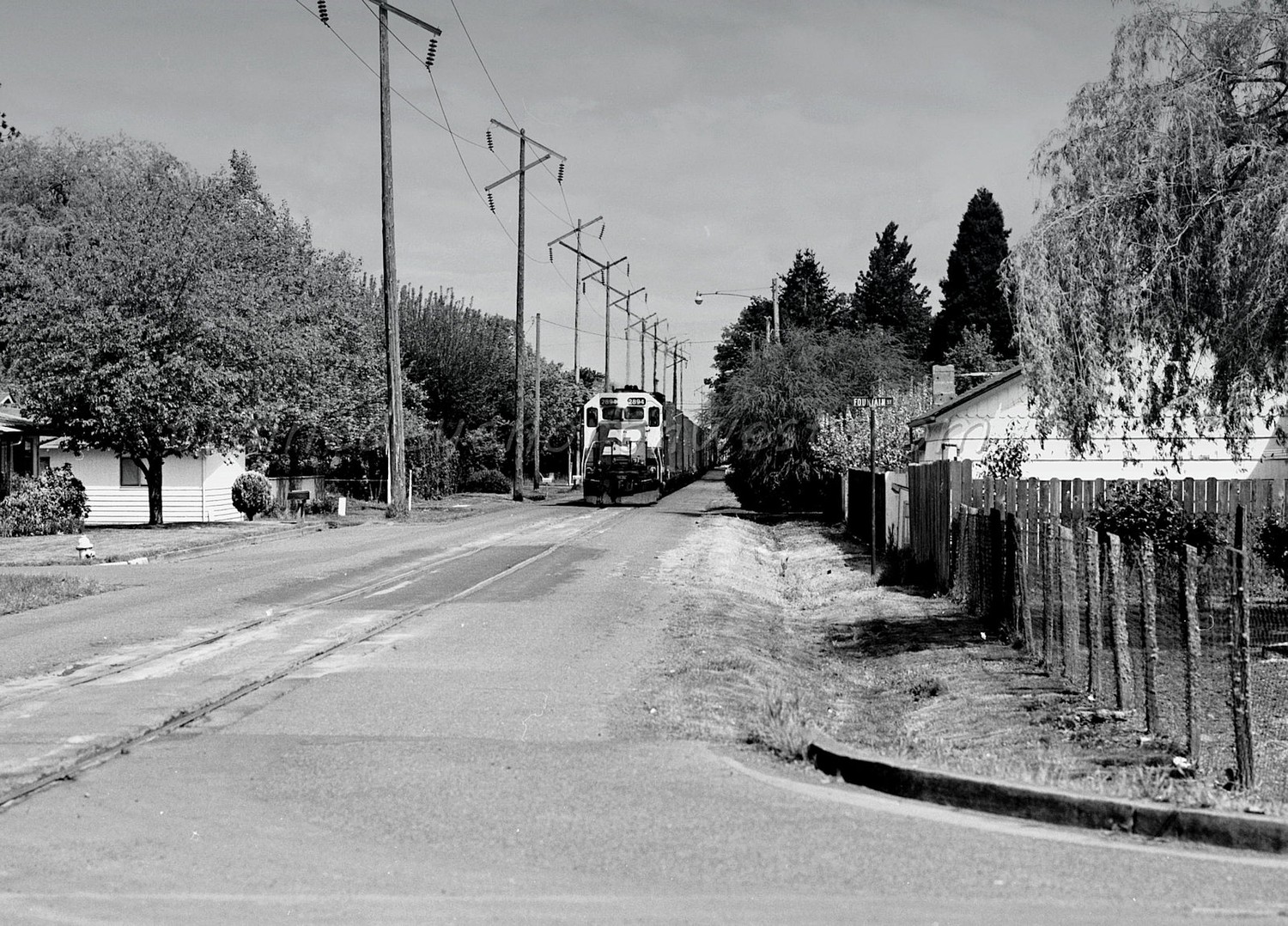 The most famous, and probably the most photographed, location for street running in the Northwest has to be in downtown Renton, WA where the old Pacific Coast Railroad mainline runs right down the middle of Houser Way South. The tracks enter the street at the intersection of South 4th Street and Burnett Ave S at the west end, and exit on the east side of Houser Way at Mill Avenue South. Up until the mid-1970s Milwaukee Road Little Joes could be seen running down the middle of the street. The Milwaukee Road disappeared in 1980. Then in the late 1980s came the Spirit of Washington Dinner Train for a period of time, now just Boeing 737 fuselages travel down Houser Way.