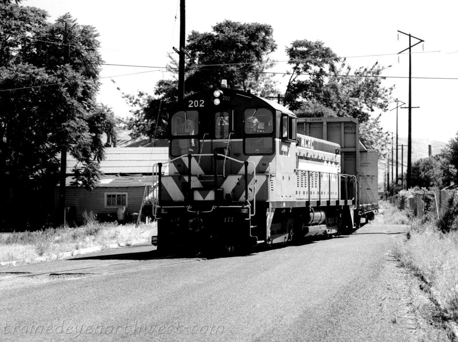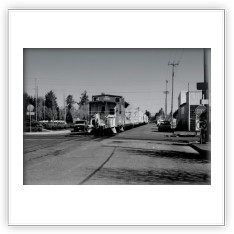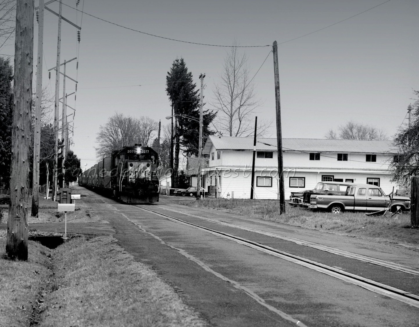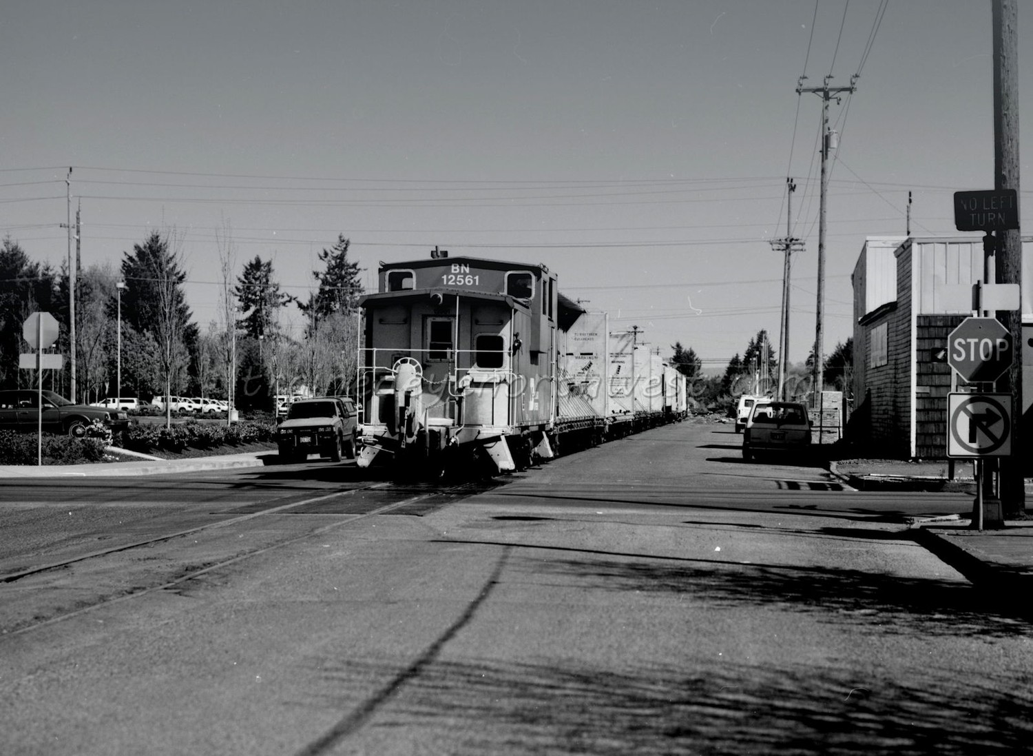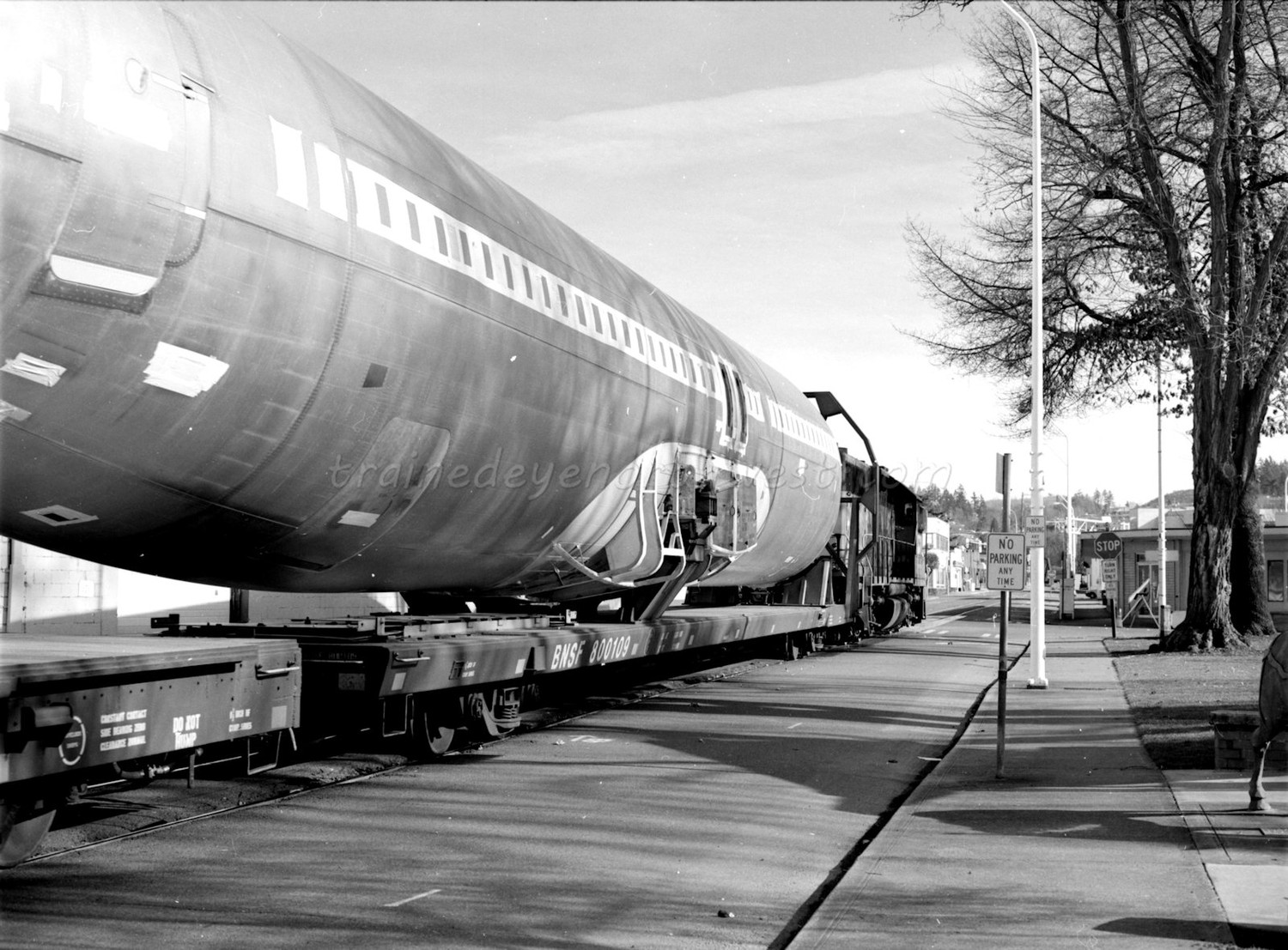 The most famous, and probably the most photographed, location for street running in the Northwest has to be in downtown Renton, WA where the old Pacific Coast Railroad mainline runs right down the middle of Houser Way South. The tracks enter the street at the intersection of South 4th Street and Burnett Ave S at the west end, and exit on the east side of Houser Way at Mill Avenue South. Up until the mid-1970s Milwaukee Road Little Joes could be seen running down the middle of the street. The Milwaukee Road disappeared in 1980. Then in the late 1980s came the Spirit of Washington Dinner Train for a period of time, now just Boeing 737 fuselages travel down Houser Way.