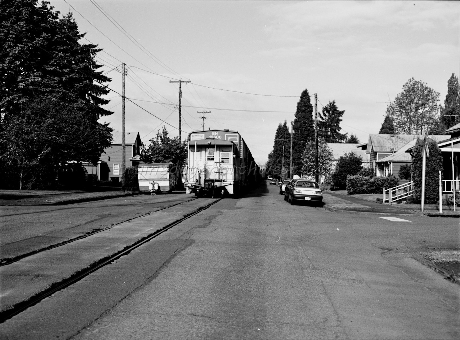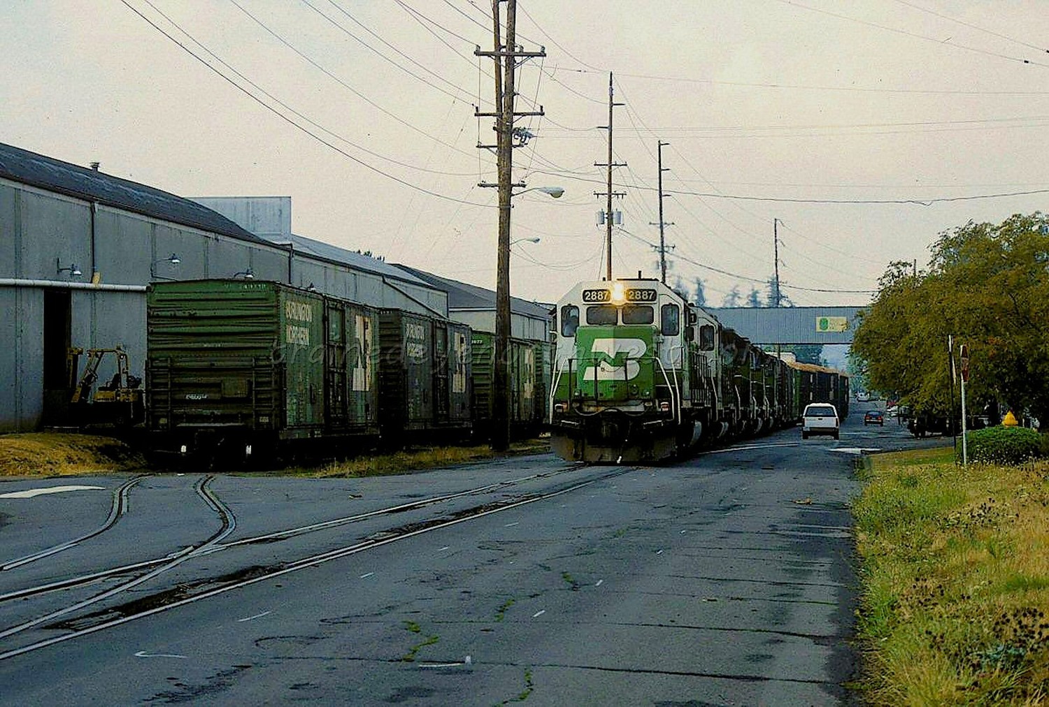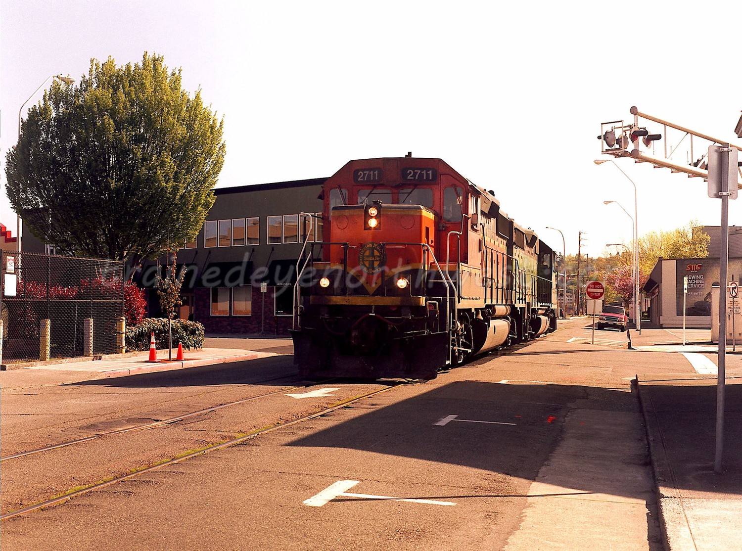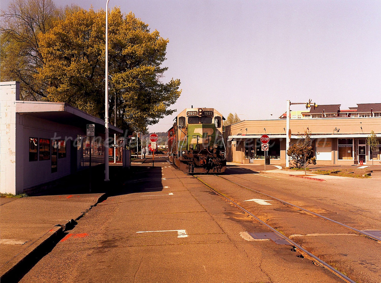 There is some in Hillsboro, Salem, and down in Harrisburg and Junction City, OR near the southern end of the OE. Hillsboro is west of Portland. When BN removed the branch line from Forest Grove Jct. to Hillsboro, this part of the BN became a small island separated from the rest of the BN. The track down the middle of Washington Street is the former SP&S, former BN tracks, while the track running down the middle of SW Adams is former Southern Pacific.