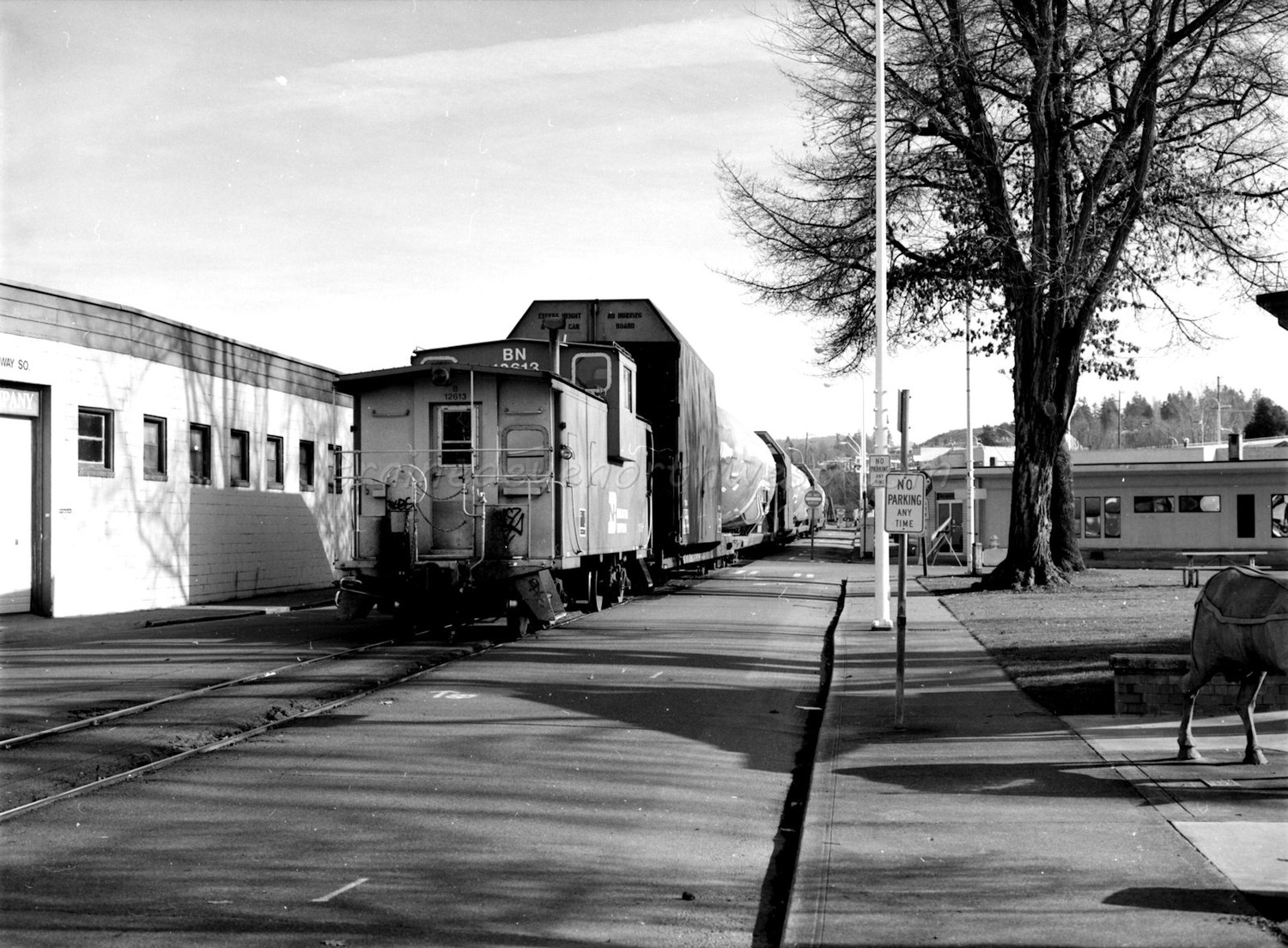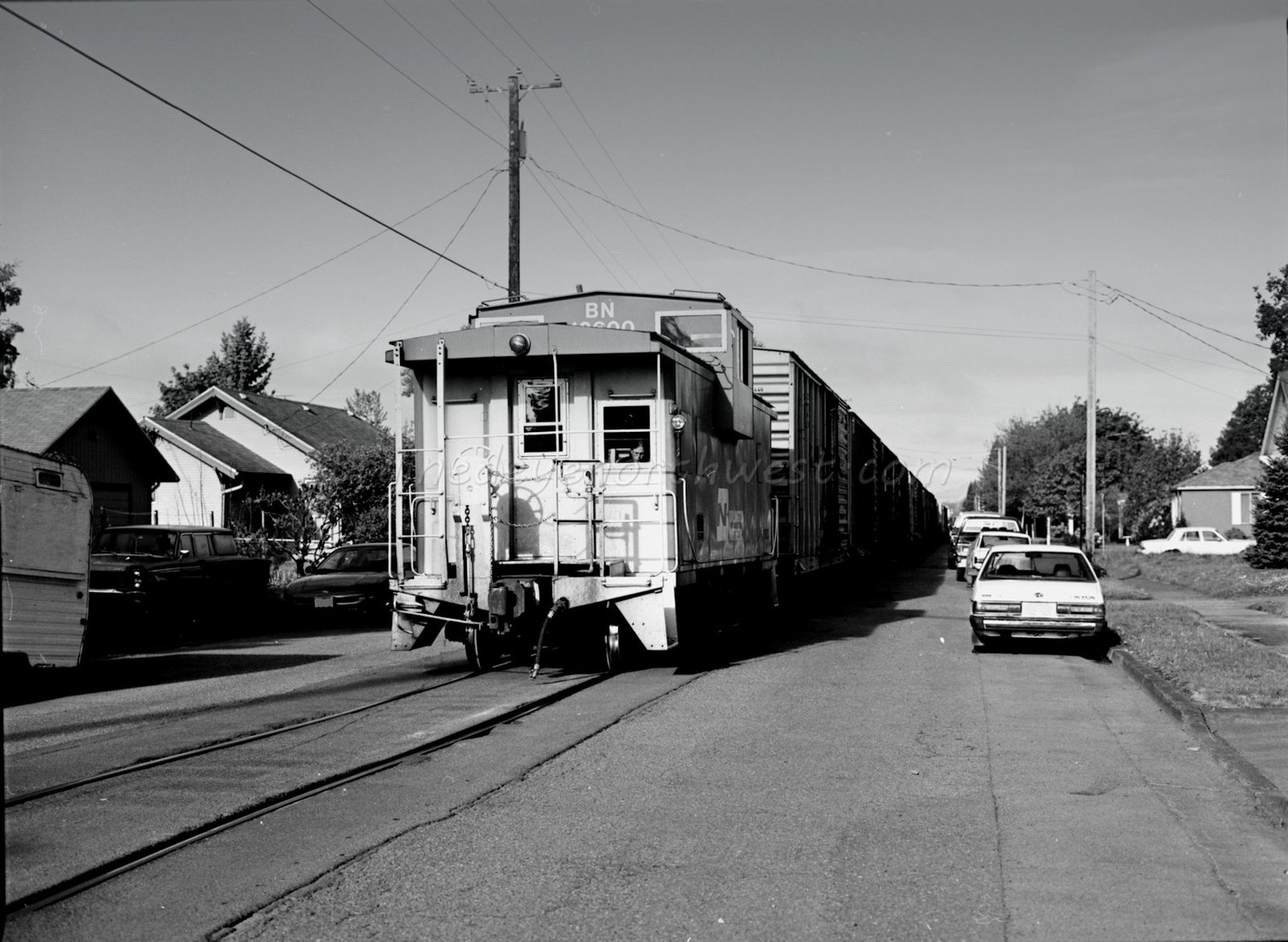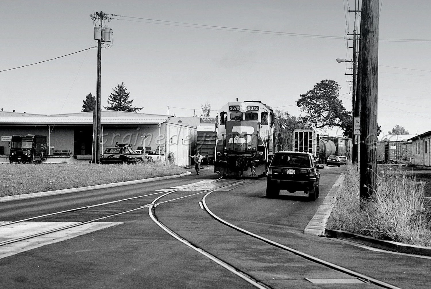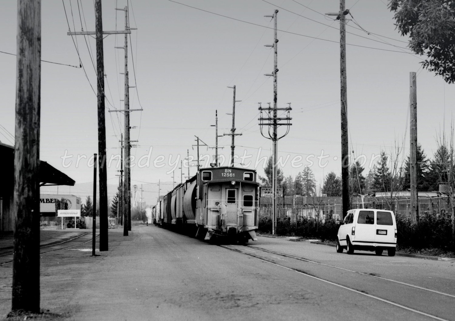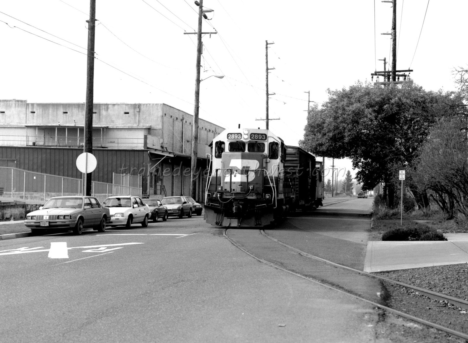 There is some in Hillsboro, Salem, and down in Harrisburg and Junction City, OR near the southern end of the OE. Hillsboro is west of Portland. When BN removed the branch line from Forest Grove Jct. to Hillsboro, this part of the BN became a small island separated from the rest of the BN. The track down the middle of Washington Street is the former SP&S, former BN tracks, while the track running down the middle of SW Adams is former Southern Pacific.