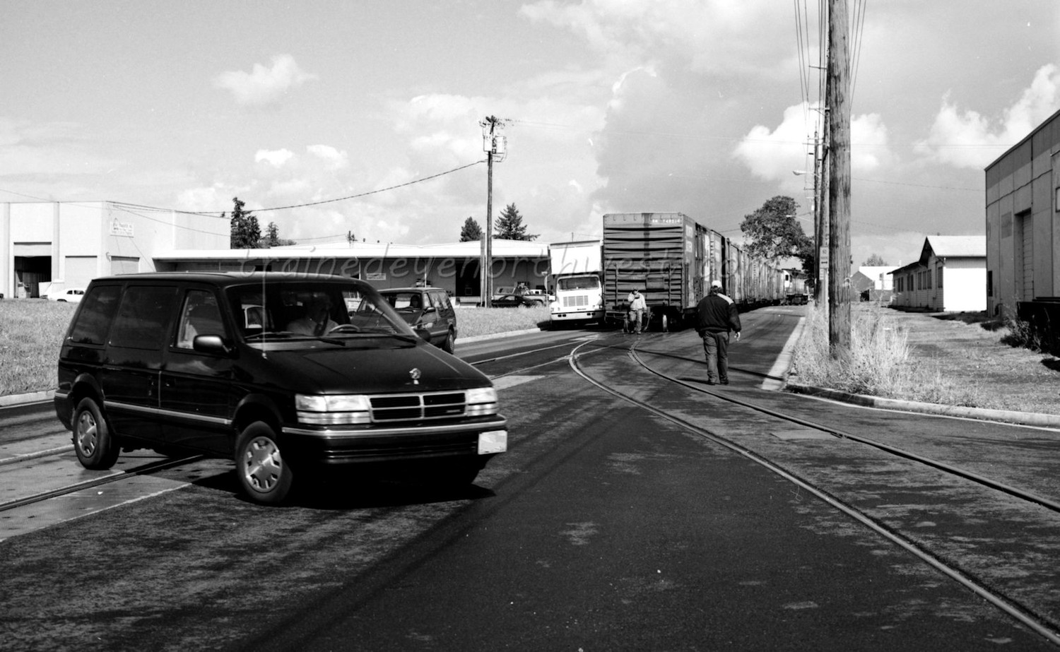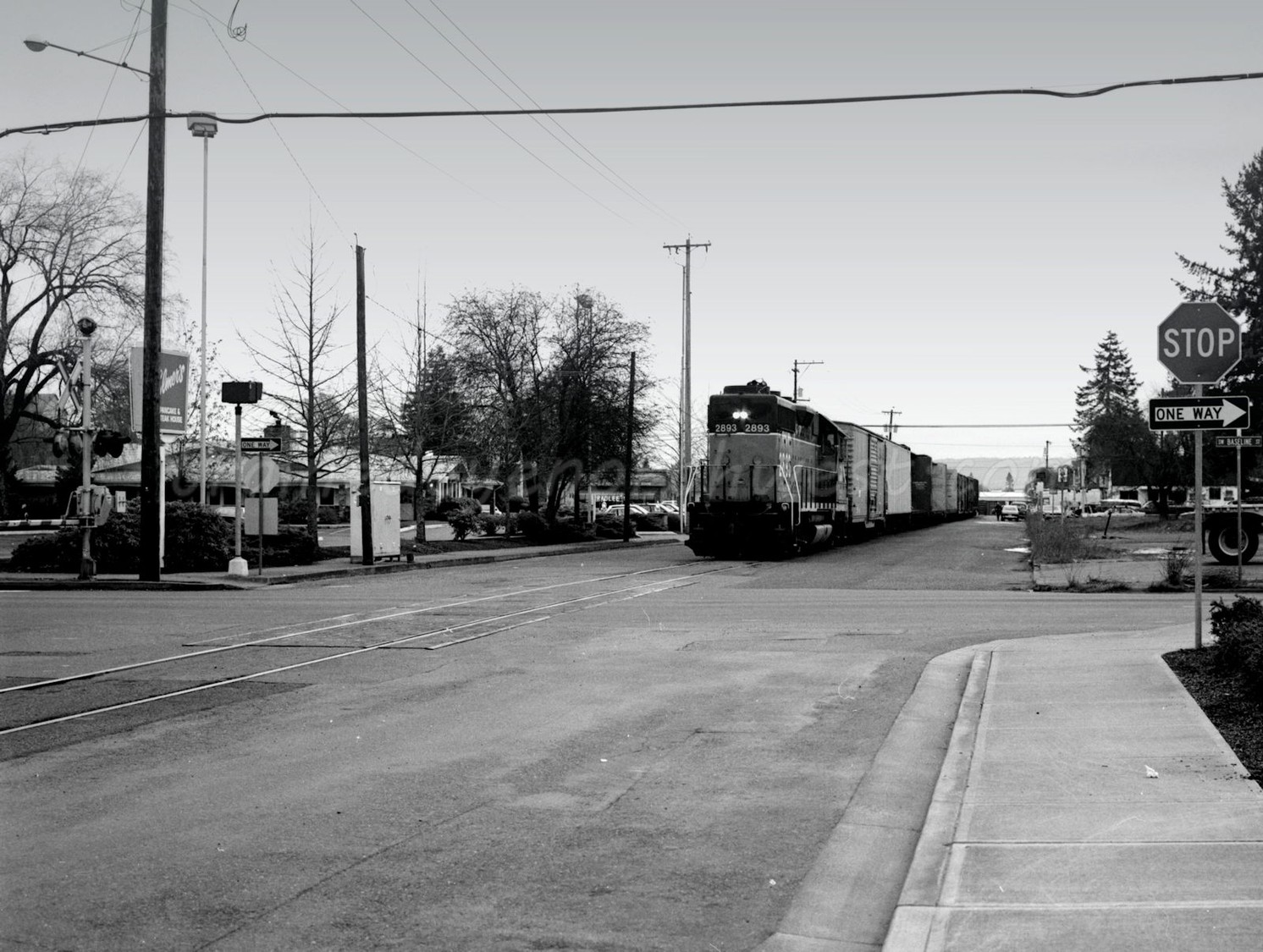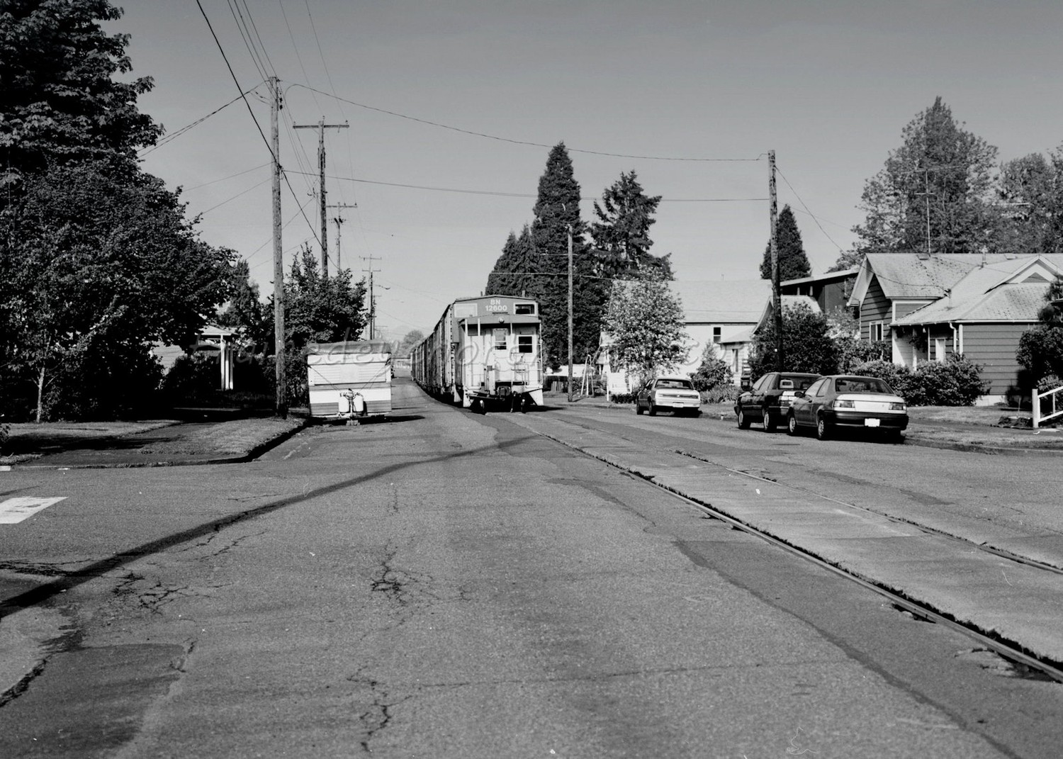 "Street Running" refers to a train traveling the middle of a street where cars normally travel. Sometimes its just not possible to have the tracks run along side a street, or vise versa. Here in the Pacific Northwest there’s a small handful of places to see street running. The old Oregon Electric line probably has (or had) the most.