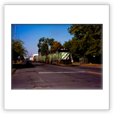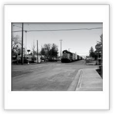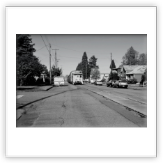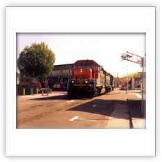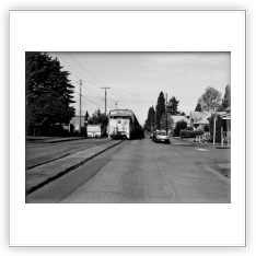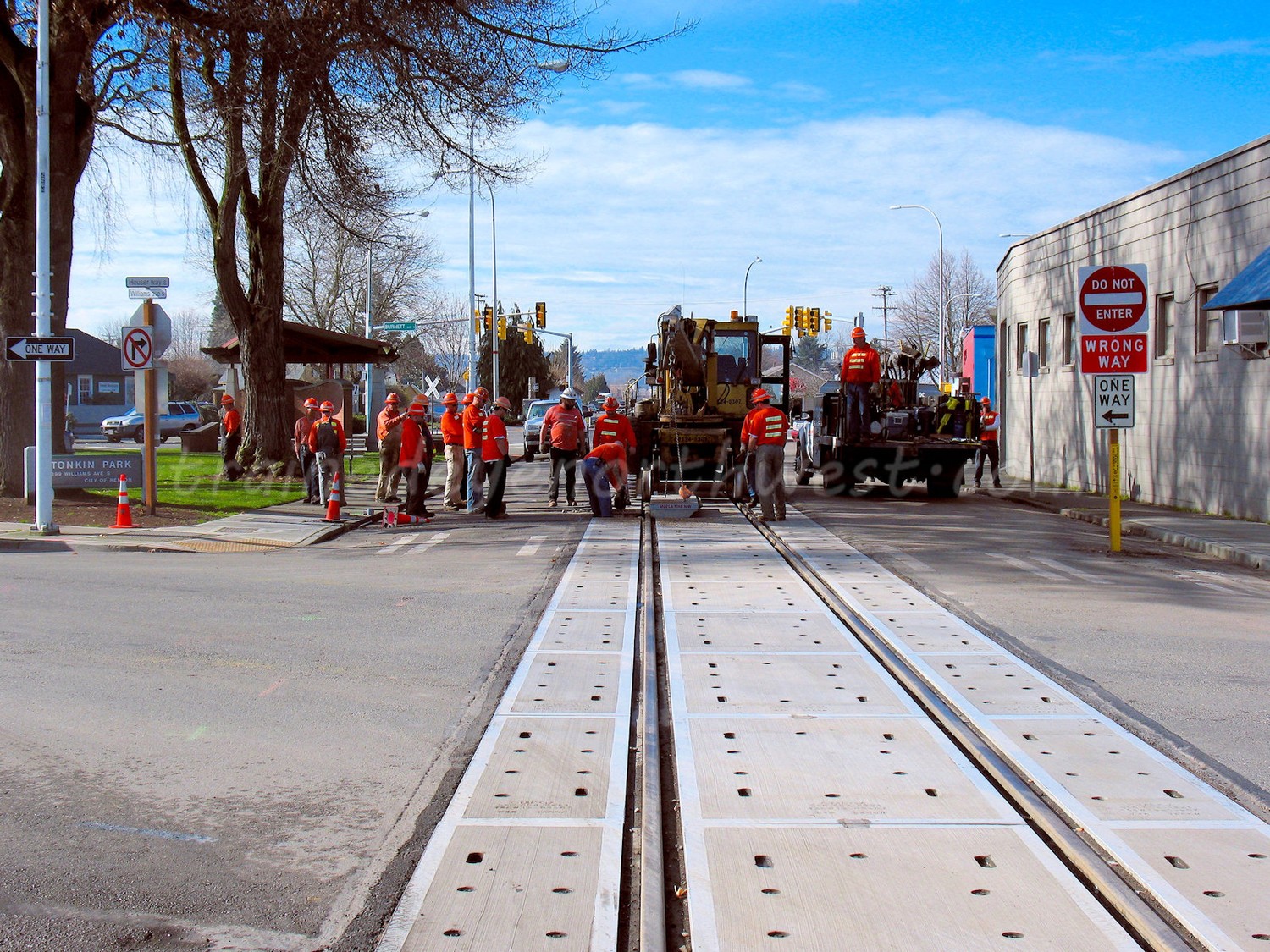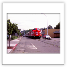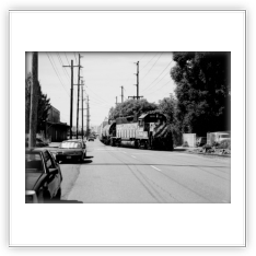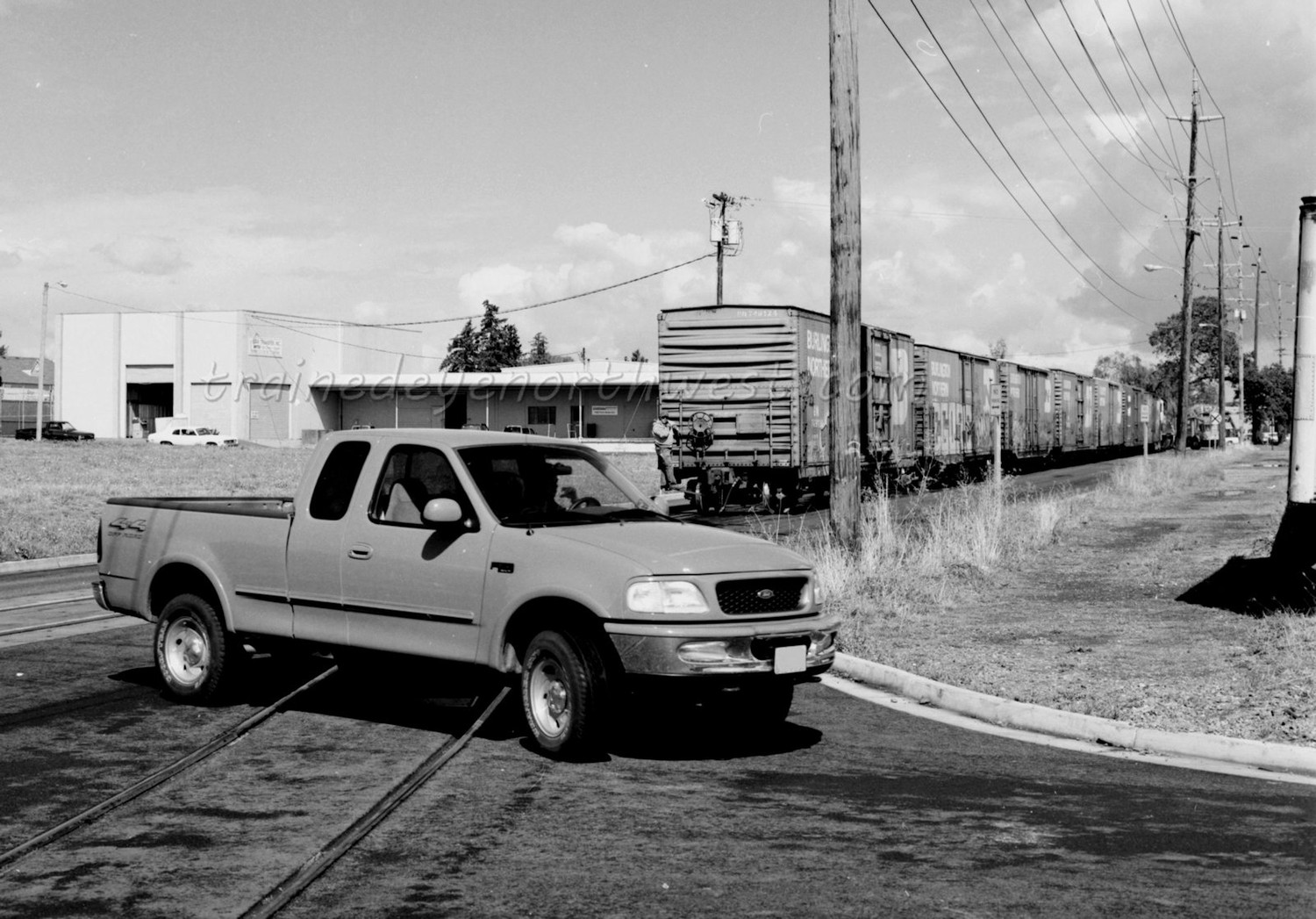 "Street Running" refers to a train traveling the middle of a street where cars normally travel. Sometimes its just not possible to have the tracks run along side a street, or vise versa. Here in the Pacific Northwest there’s a small handful of places to see street running. The old Oregon Electric line probably has (or had) the most.